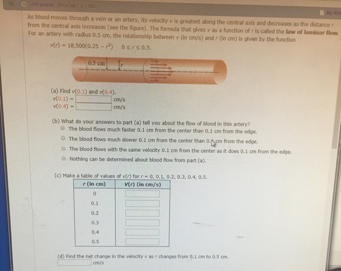 Solved As Blood Moves Through Vein Or Artery Its Velocity Is Greatest Along The Centra Axis And Decreases As The Distance From The Central Axis Increases See The Figure Below For An Artery